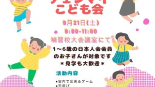 未分類 9月のこども会 【日時】2024年9月21日(土)9時~11時【場所】補習校大会議室【活動内容】室内でできるゲームや手遊び、ダンス、絵本読み聞かせ等日本人会会員のお子さんで対象年齢(1~6歳)であればどなたでもご参加いただけます。見学も大歓迎ですので、ご希... 2024.10.30 未分類